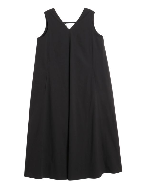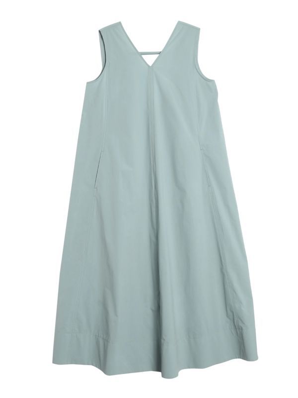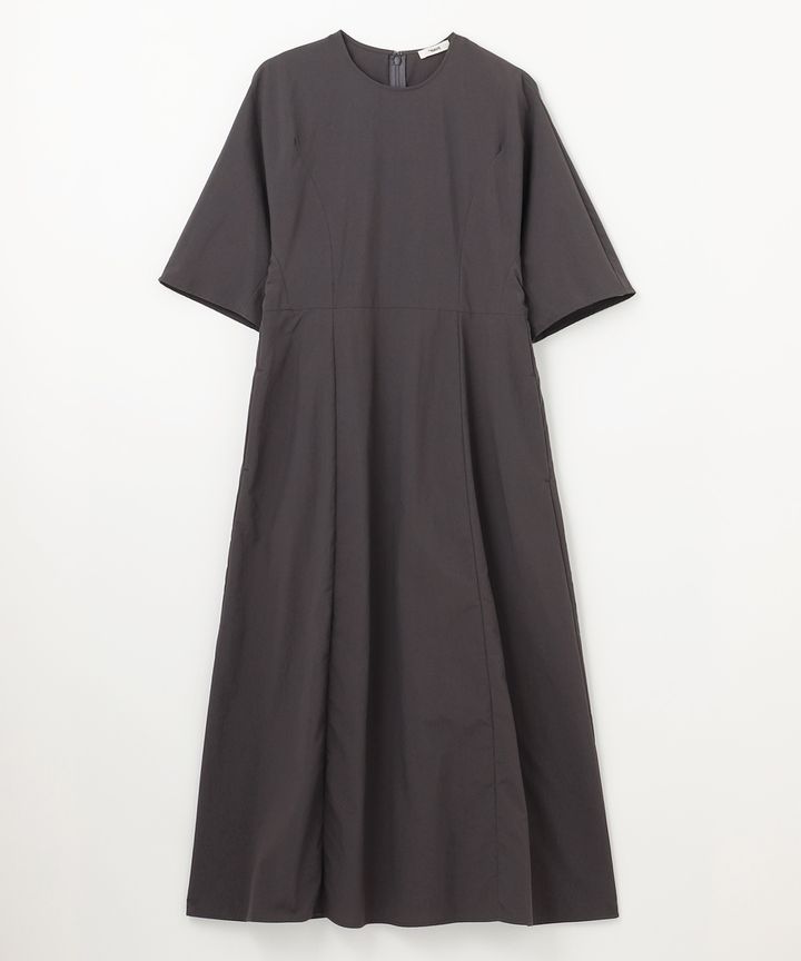 撥水加工のワンピースはデイリーはもちろん、海や川など子どもと楽しむ水際シーンでも活躍。バックスタイルはU字に開いたひとクセデザインで、程よい抜け感が◎。広がりすぎないフレアシルエットが大人っぽい印象に。両サイドのポケットもうれしい。