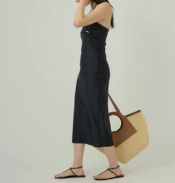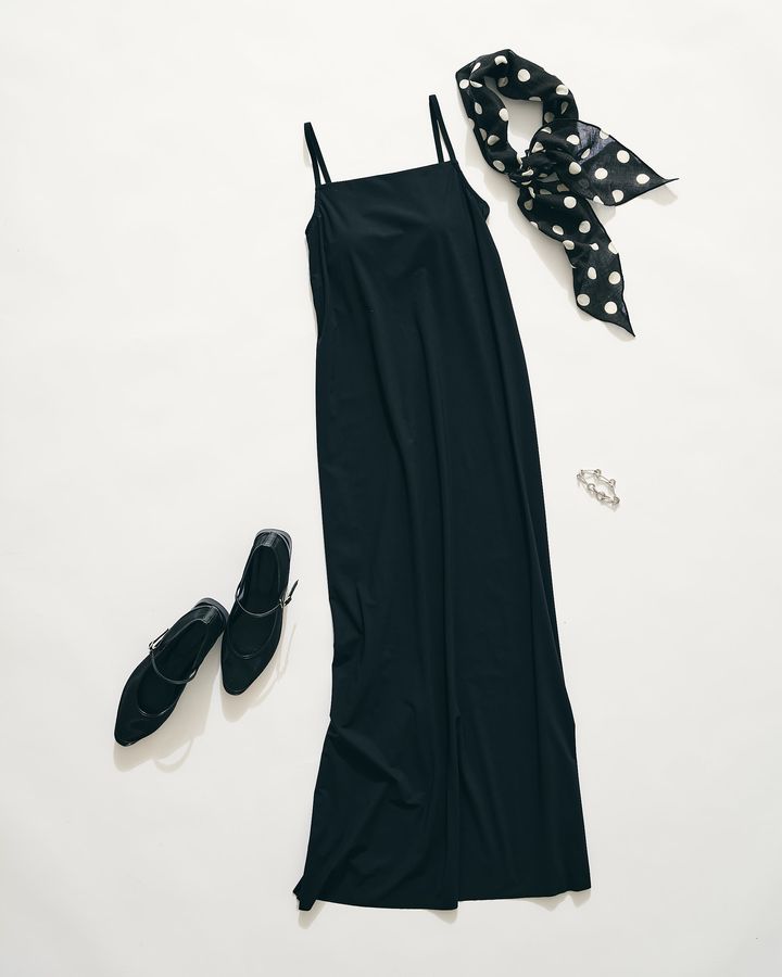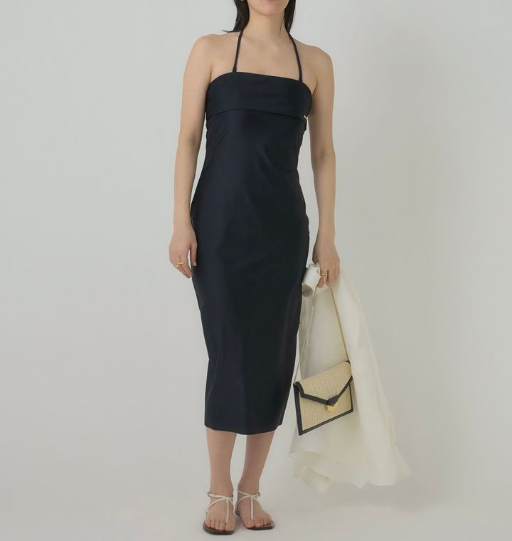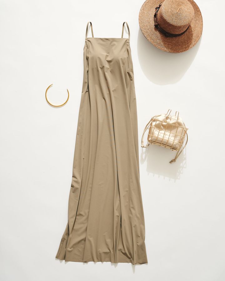 リゾートで着たいのは水着素材で作られたロングドレス。カップ付きで一枚でサマになります。足首が隠れるフルレングス丈で水着でも大人っぽく着こなせるのがうれしい。程よい首元の詰まり具合と、アメスリ風のデザインも今年らしい。