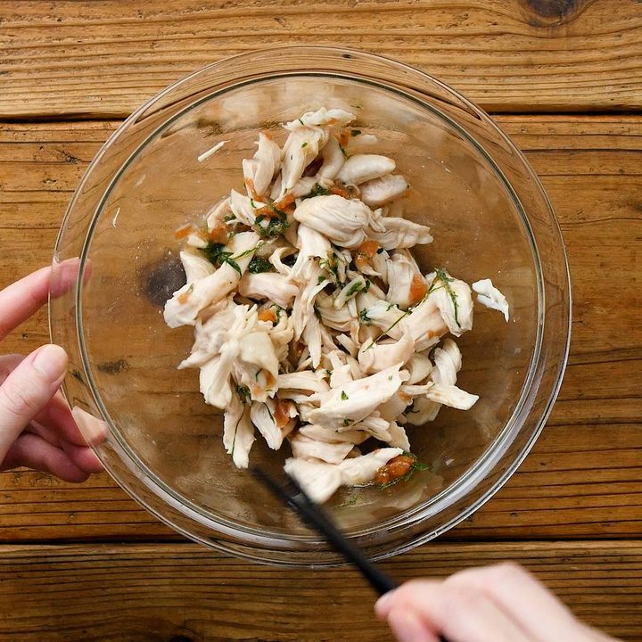 4: 鶏ささみを手で裂いて加え、全体をよく混ぜ合わせたら完成です。