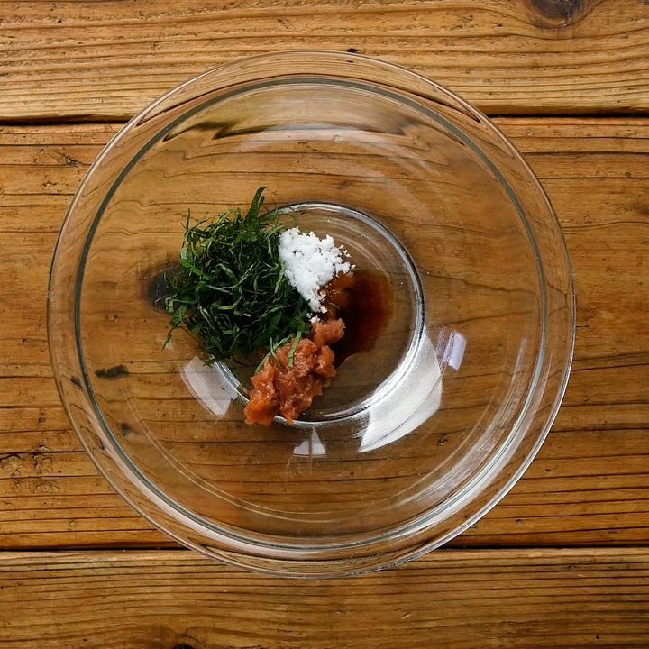3: ボウルに梅干し、大葉、砂糖、しょうゆを入れて混ぜ合わせます。