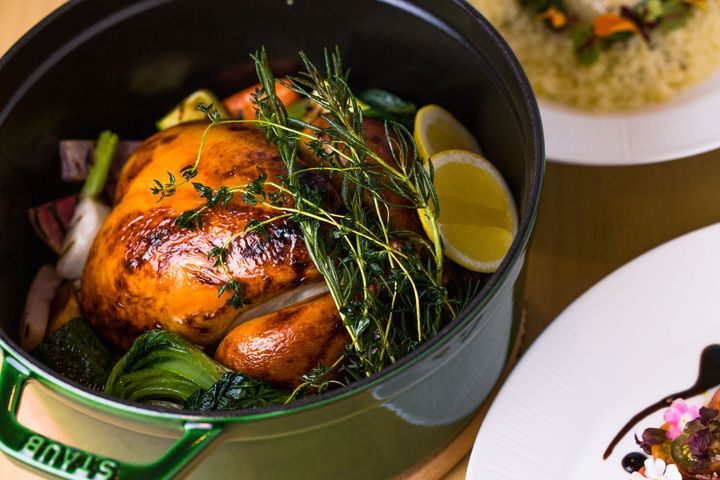 ローストチキン 農園野菜のハーブロースト、東京産柚子胡椒、レモン 東京味噌とフレッシュハーブソース¥7,600 数人でシェアして食べたい、丸鶏をローストしたボリューム満点の一皿。〈陽子ファーム〉の野菜のローストが添えられています。地元産の柚子胡椒や東京味噌のソースをお好みに合わせて使ってお召し上がりいただけます。