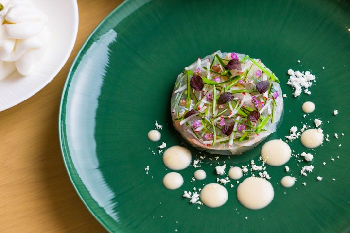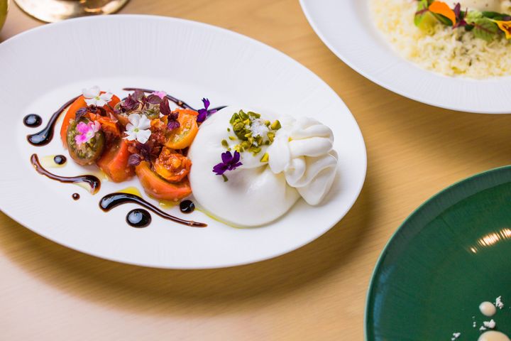 東京ブラータカプレーゼ ドライトマト、ピスタチオ、東京黒酢¥4,600 東京で作られるクリーミーで濃厚な「東京ブラータ」を使用。添えられたドライトマトやピスタチオがアクセントになっています。バルサミコ酢の代わりに用いられた〈横井醸造工業〉の「真黒酢」は、濃厚な味わいとキリッとした酸味で、全体を引き締めています。