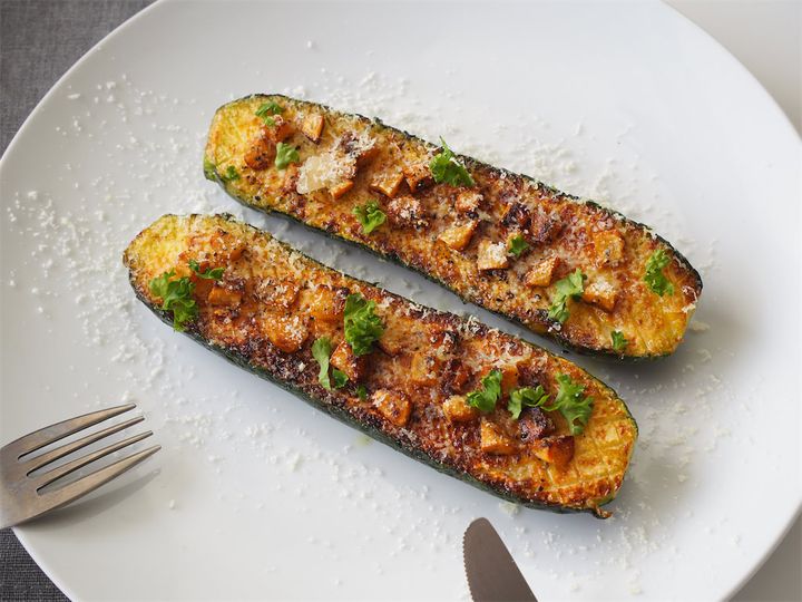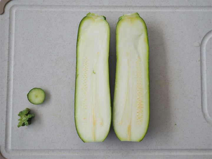 1. ズッキーニの両端を軽く切り落とし、縦に半分に切る。