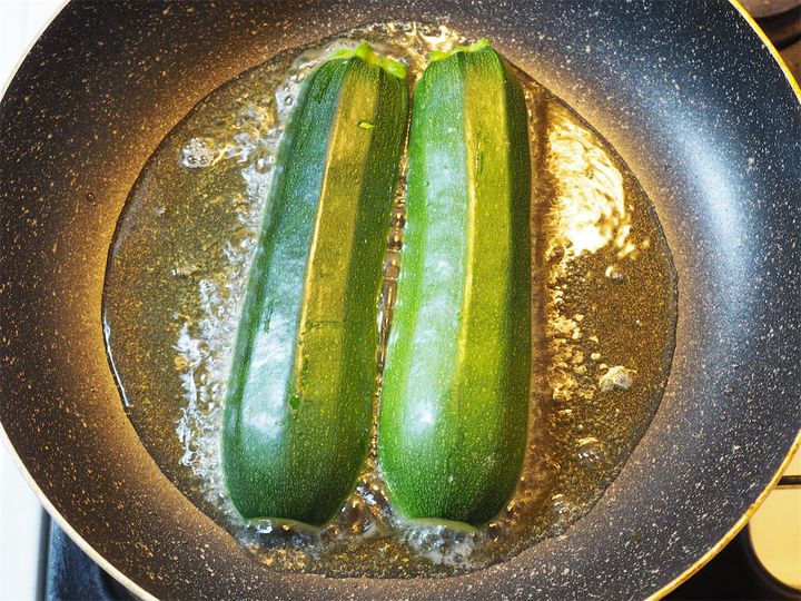 オリーブオイルはズッキーニの断面がしっかり浸かるくらいの量がいいとのこと。今回初めに大さじ4ほど入れましたが、多過ぎたため途中でキッチンペーパーで少し吸い取りました。使うフライパンによりますが、大さじ2くらいでいいかも。