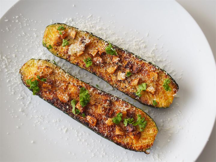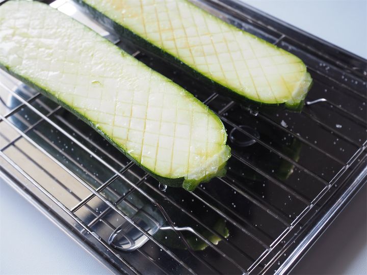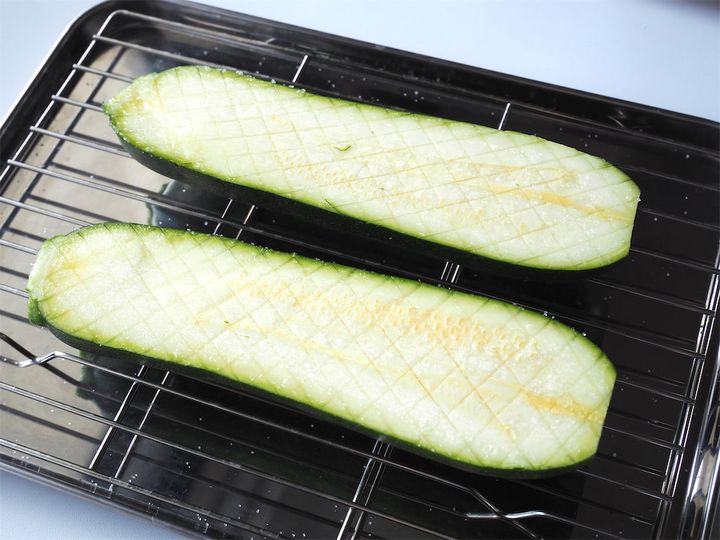 ズッキーニの断面はどうしても完全にまっすぐにはならないため、そのまま焼くと焼き色にムラが出来てしまうそう。なので、重しをしてあげると均等に焼き色がつきやすくなるんだとか。動画では、クッキングペーパーの上にお皿、さらにその上から重そうな鍋を乗せていました。