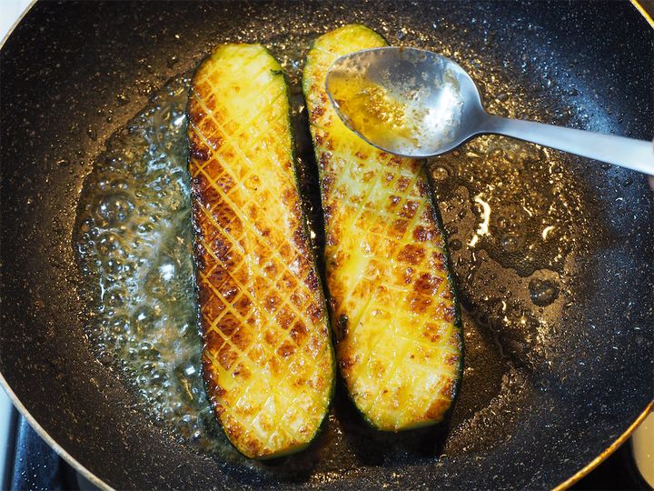 3. 【2つ星店元料理長の実力】「ズッキーニの底力を引き出す焼き方」に挑戦!水分抜き・重し・焦がしバター