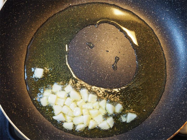 5. フライパンに3のにんにく、オリーブオイルを入れ弱火にかけ、じっくりと香りを引き出していく。ほんのり焼き色がついたら、にんにくだけお皿に取り出しておく。