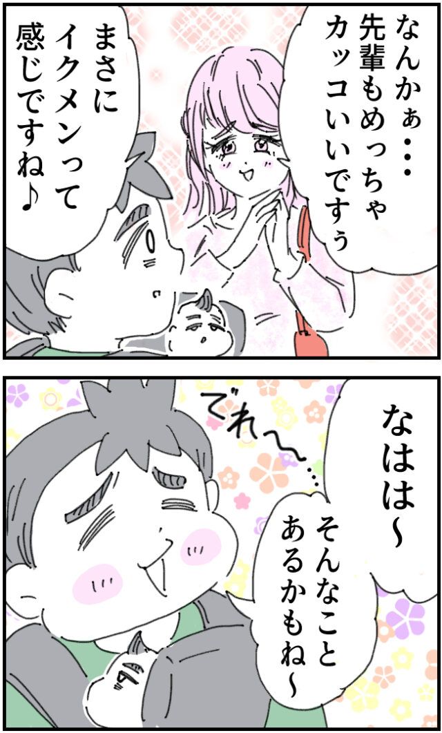 そして「なんかぁ・・先輩もめっちゃカッコいいですぅ!まさにイクメンって感じですね!」といちろうさんをべた褒め。それを聞いて「なはは~!そんなことあるかもね~」いちろうさんは、デレデレしながら良い気分になりました。
