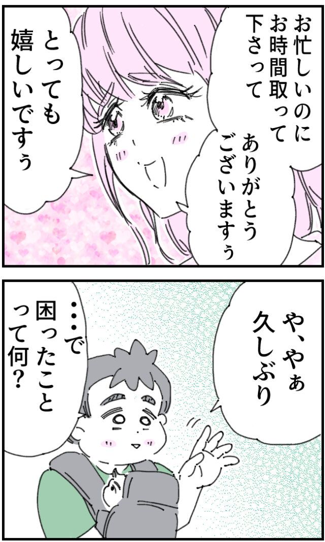 「お忙しいのにお時間取ってくださってありがとうございますぅ。とってもうれしいですぅ」といちろうさんに声をかける白石さん、そして「や、やぁ、久しぶり・・で、困ったことって何?」といちろうさんは会うなり用件についてたずねました。