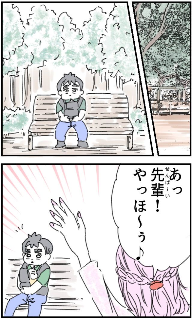 こはるちゃんを抱っこして公園までお散歩に行くとかおりさんに伝えて家を出たいちろうさん、そこには「会社の後輩白石さんと会う」という目論見もありました。公園に到着しベンチで白石さんを待ついちろうさん、「あっ、先輩!やっほ~ぅ!」と向こうから白石さんがやってきました。