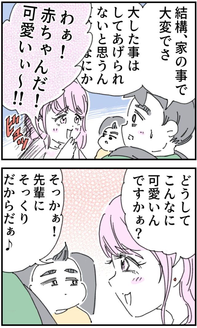 こはるちゃんと公園までお散歩する、かおりさんにそう伝えて家を出たいちろうさん、それは「白石さんを助けてあげたい!」といちろうさんが考えた作戦でした。そして公園に到着して待っていると「あっ、先輩!やっほ~ぅ!」と向こうから白石さんがやってきました。挨拶もそこそこに「や、やぁ久しぶり・・で、困ったことって何?」と話を切り出すいちろうさん、「結構、家の事で大変でさ、大した事は・・」と話している途中で「わぁ!赤ちゃんだ!かわいい~!!先輩にそっくり!」と、こはるちゃんを見てうれしそうに言う白石さんに「先輩もめっちゃカッコいいですぅ~。まさにイクメンって感じですね!」と言われ「なはは~そんなことあるかもね~」といちろうさんはデレデレでした。