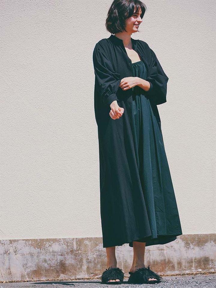 キャミワンピとは対照的な、長そで&えりつきの端正なシャツワンピを羽織りとして投入。長い黒の印象はそのままに、質感の変化やそでをまくったりすることで立体感が生まれて、凝った見た目へと誘導。