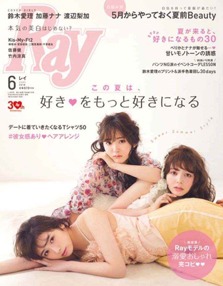 3度目の表紙は加藤ちゃん、べりか(渡辺梨加)といっしょ。Rayの描く甘い女のコをロマンティックに表現しました。愛理&べりかのペア企画も続々出てきた時期♡