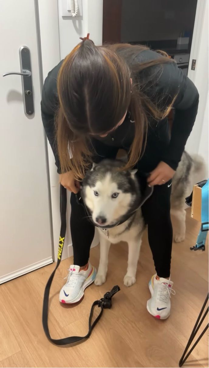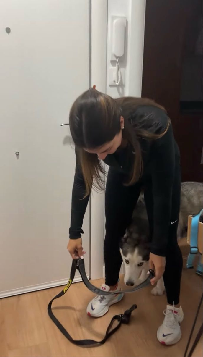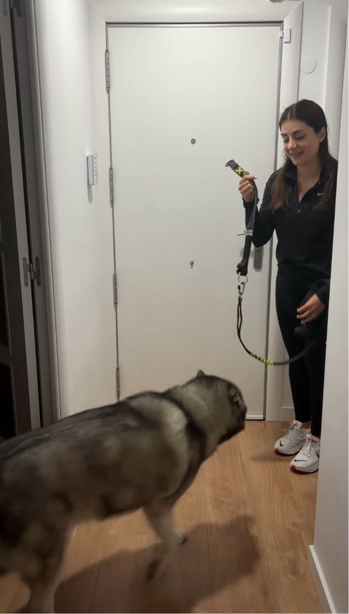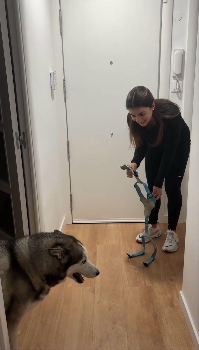 お出かけできると喜んだのも束の間、ジョギング用のハーネスを装着されそうになって後ずさりするハスキー犬。 ところが、次におさんぽ用の首輪を差し出されると・・・!