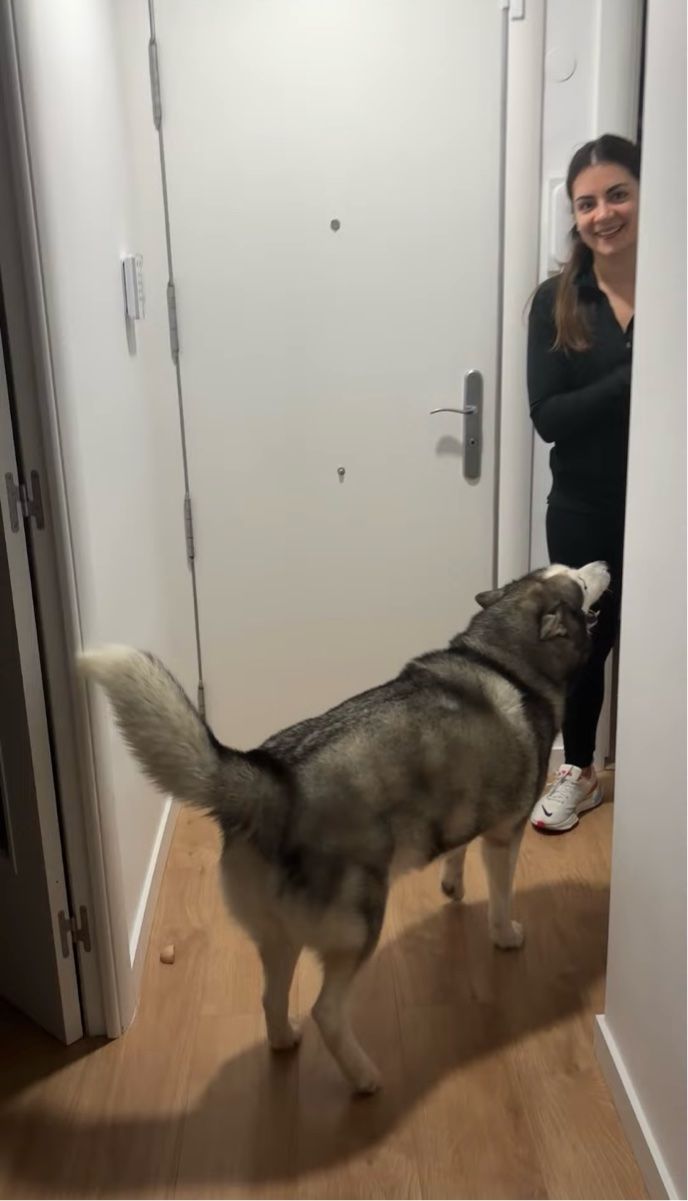 玄関前で尻尾を振っているのは、ハスキー犬の『アシェル』。 「お出かけできる!」と喜んでいるみたいですね。