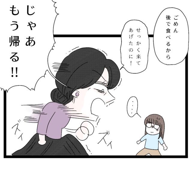 「えー!せっかくあなたの為を思って作ったのに!」実母にそう言われ、何とか食べようとしましたが、「う゛っ・・」こみ上げる気持ち悪さに耐えられず、再びトイレに駆け込むアサ子さんは、トイレから戻ると「ごめん、後で食べるから」と実母に伝えました。すると「せっかく来てあげたのに!じゃあもう帰る!!」と実母は叫びだします。