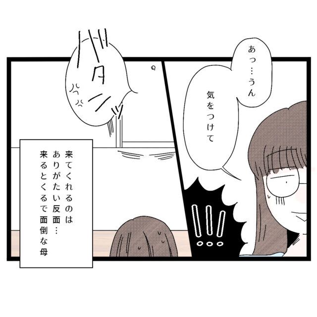 そんな実母を見たアサ子さんが「あっ・・うん、気をつけて」と実母に伝えると、アサ子さんのリアクションに拍子抜けしたのか、「バタンッ!!」ドアを閉めて帰ってしまいました。実母が帰った後のドアを見つめながら「来てくれるのはありがたいけど、反面、来ると来るで面倒な母・・」アサ子さんは心の中で呟きました。