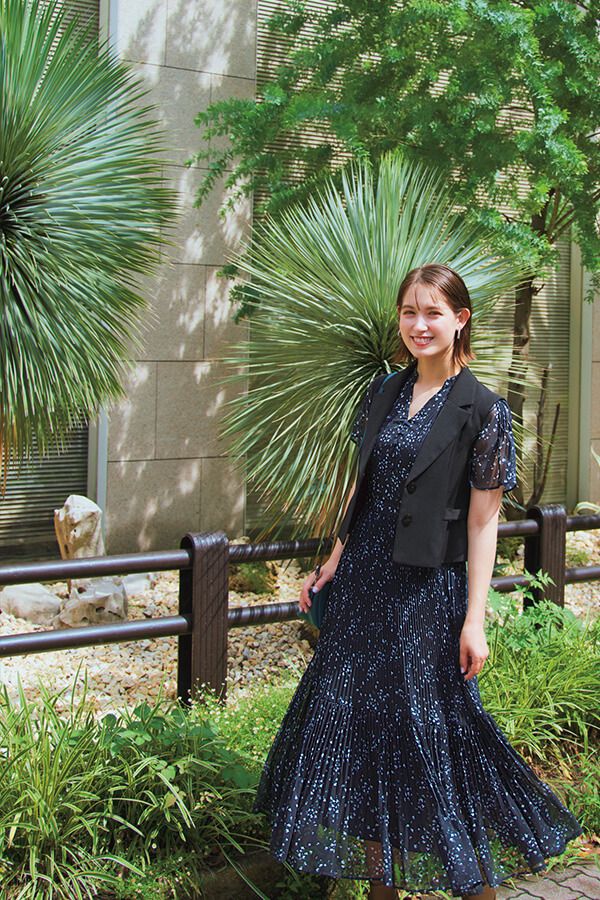 ロマンティックな花柄ドレスにショートジレできちんと感を