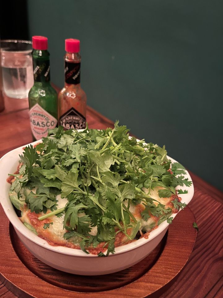 焼いたキーマカレーの下にアボカドが入っており、上に大量のパクチーをトッピングしています🌿