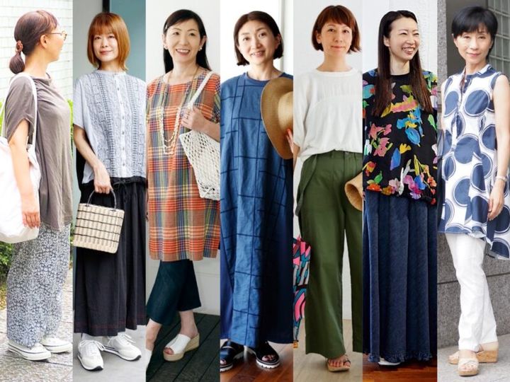 「小柄なのでサイズに困ることが多いのですが、良いものを長く着たいので自分に合うかどうかを見極めて洋服を選ぶようにしています」と大向さん。この日は「ナラカミーチェ」のコットンチュニックに細身のパンツを合わせることで、すっきり見えるIラインコーディネートに仕上げています。「見た目からも涼を感じられるよう、ネイビーとホワイトを取り入れてみました」