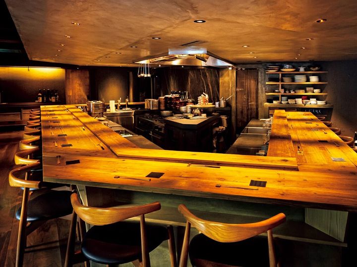 『創和堂』の主役である広い変形カウンターは、どの席に座っても他席のゲストと視線がぶつからない設計に。ふたりの世界に没頭できる