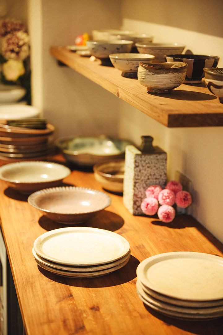 陶芸家でもあるオーナー夫人の作品が並ぶ店内は、ナチュラルでハイセンスな空間。器はその場で購入することも可能だ