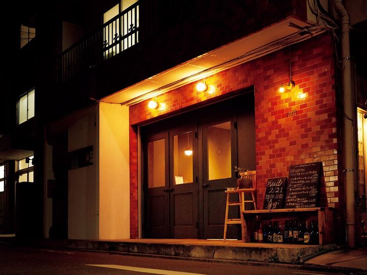 センスを醸すビストロ『nuit』。外観はブラウンのタイル貼り。店名のプレートも控えめで落ち着きを感じさせる