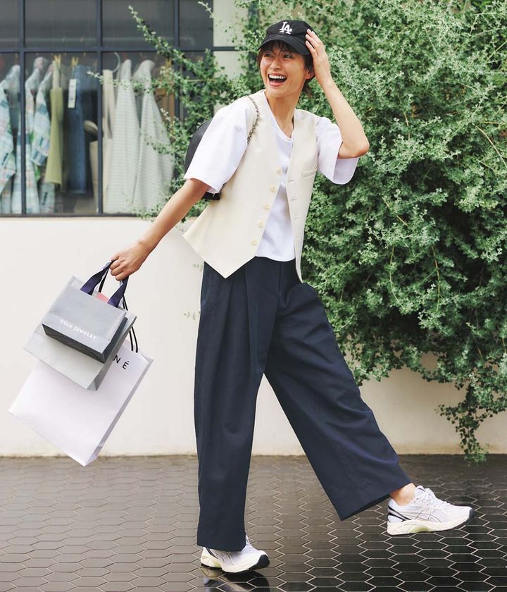 Tシャツ×タックパンツの軽快カジュアルでショッピングへ。ラフなオシャレの日こそ旬のベストや小物で盛り上げて手抜き感を払拭!白×ネイビーの配色が清潔感と都会的な印象を演出してくれます。