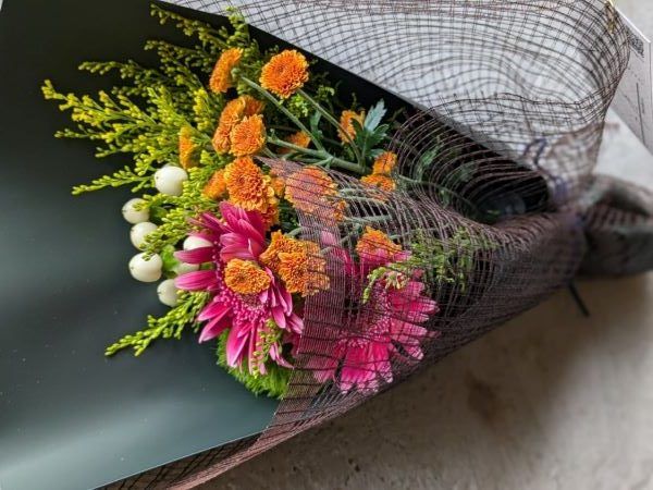 こちらでは、フラワーレッスンも行っています。3、4名から、メール、電話、Instagram DMで予約できます。(前日まで) 一般的なお教室とちょっと違い、型にとらわれずに、生徒さんそれぞれの感覚で、好きなように生けることができるそうです。 生徒さんの気持ちを優先しつつ、しっかりとポイントは抑えてレッスンしてくださるとのことですよ。 今回こちらの花束を作っていただいたのですが、とっても私好み♪