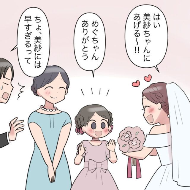 「はい、美紗ちゃんにあげる~」と恵さんは、持っていたブライダルブーケを美紗に渡してくれたので美紗は大喜びです。夫だけは「まだ早すぎる」と焦っていましたが(笑)。