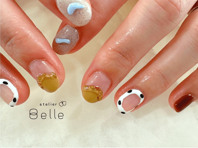 クリアカラーのベースに、指1本1本異なったこだわりアートを入れています。