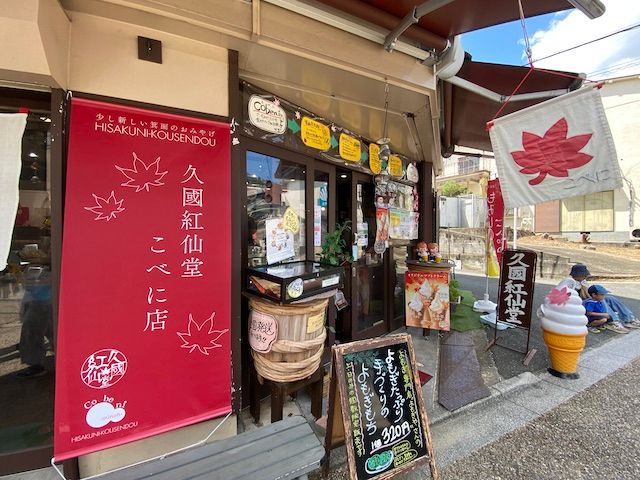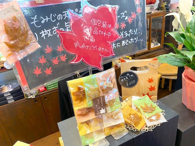 久國紅仙堂さんのもみじの天ぷらは、プレーン・しお・七味・きな粉・黒糖・グリーンティなどざまざまなフレーバーがありますが、まずは伝統のプレーンの最後の1袋をゲット。1枚ずつ個包装されているものもあったので、ばらまき土産にもよさそうです。割れてしまうのが気になる場合は、贈答用の箱詰めがおすすめ。