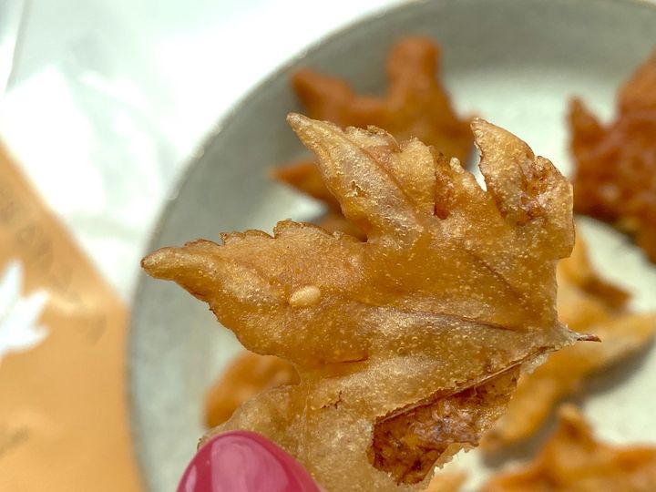 開けてみると、天ぷらと言われてイメージするものと違い、かりんとうのようなカリッとした食感なのだろうと思わせるビジュアル。箕面の紅葉は11月頃からですが、1年塩漬けにしたもみじの葉を使っているため、もみじの天ぷらは1年中楽しめます。