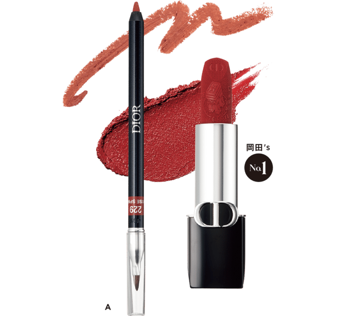 「リップラインがまた来てます!」Aルージュ ディオール コントゥール229 ¥4,290(パルファン・クリスチャン・ディオール・8月2日発売)、リップは岡田さんが選ぶ秋新作No.1アイテム、ルージュ ディオール 720 ¥6,270(パルファン・クリスチャン・ディオール・9月6日数量限定発売)