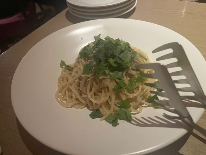 「ジャコと大葉、自家製カラスミのアーリオ・オーリオ」