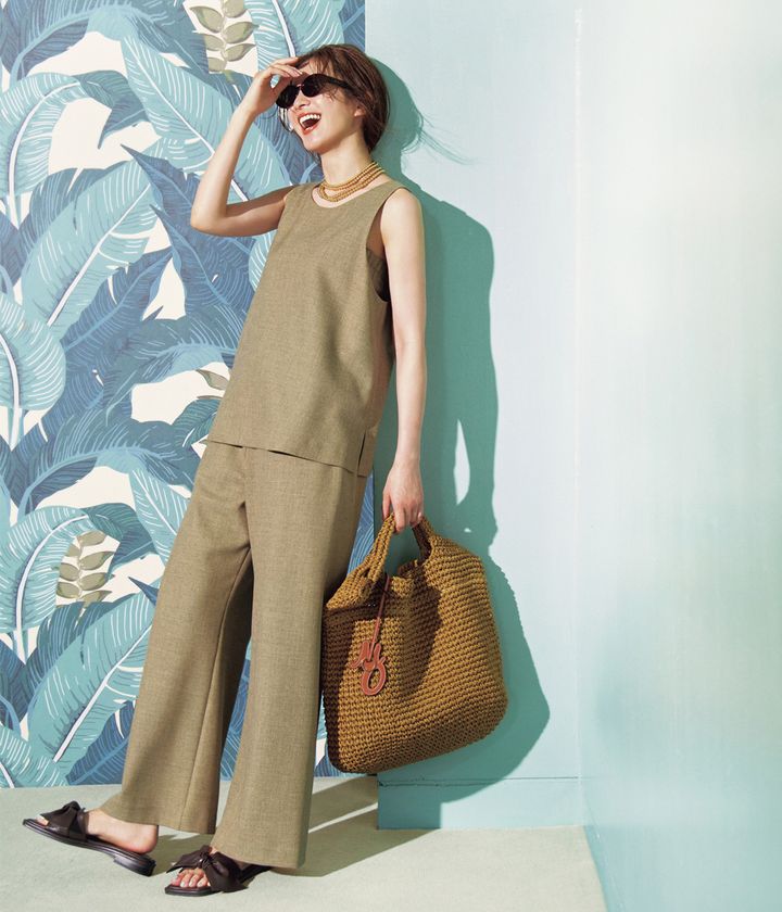 程よい光沢感と落ち感ある素材が大人のリラクシースタイルをかなえてくれるセットアップ。インナービスチェ付きノースリーブブラウスと、ウエストゴムのイージーパンツはストレスフリーな着心地でデイリーはもちろん夏旅のお供にも最適。