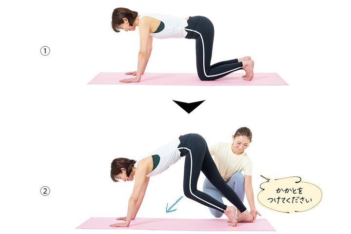 目線は下に。脚はこぶし1つ分の幅をあけて、つま先を立て、よつんばいの姿勢をとる。ふくらはぎの筋肉を効率よく刺激できます。