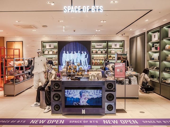 ここでしか買えないグッズもあり!買物ついでに推し活できる!老舗高級百貨店の新世界デパートの免税フロアにある公式ショップ。店内ではMVが流れていて鑑賞しながらショッピング。Butter、Yet To Come in BUSANなど買いそびれた過去のグッズも購入することができる。