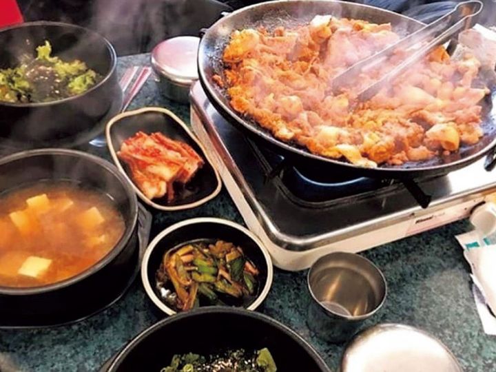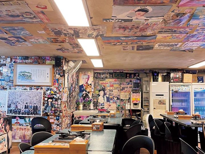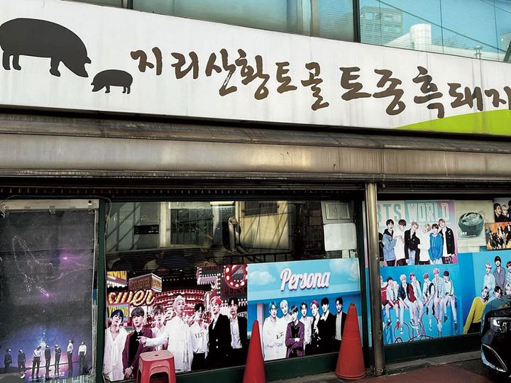 下積み時代からBTSを支え続けてきた、いわずと知れたバンタン食堂。ピリ辛に焼いた黒豚とご飯を葉に包んで食べるユジョンサンパッはオーダー必須。