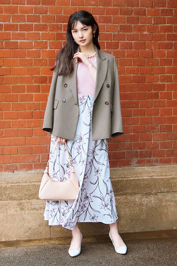 ジャケットのチャコールブラウンでピンクの面積をオフ。線の細い上品な花柄スカートも、顔タイプ・キュートさんと好相性♡
