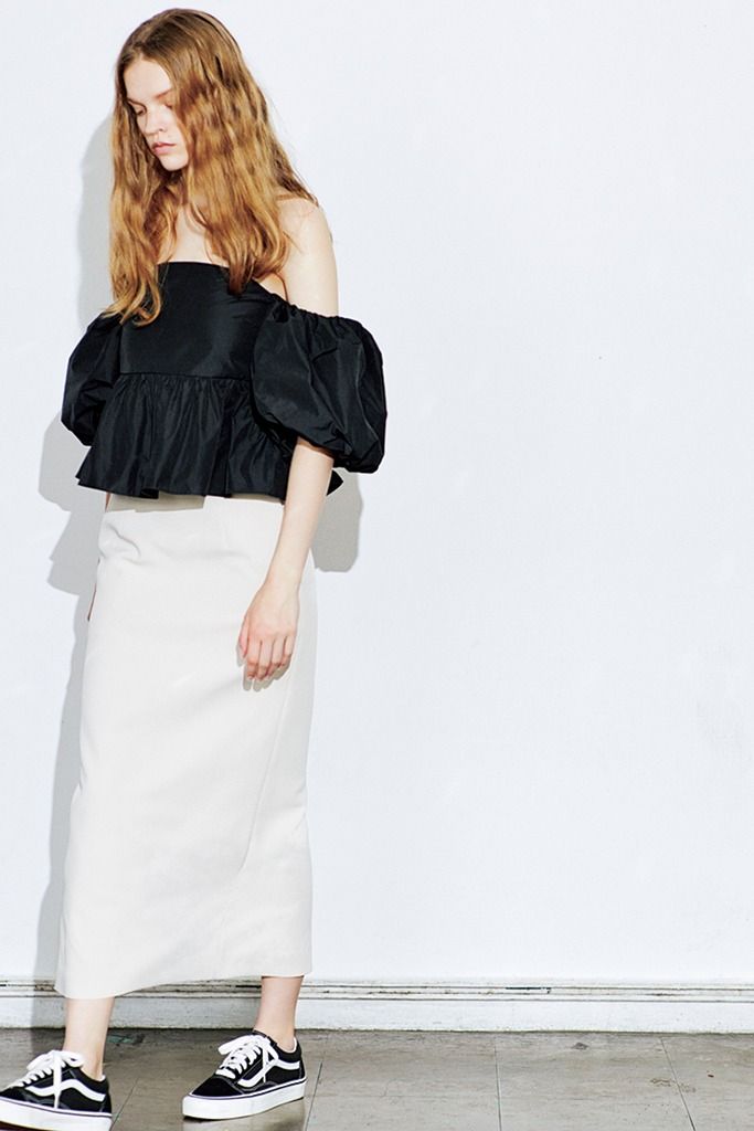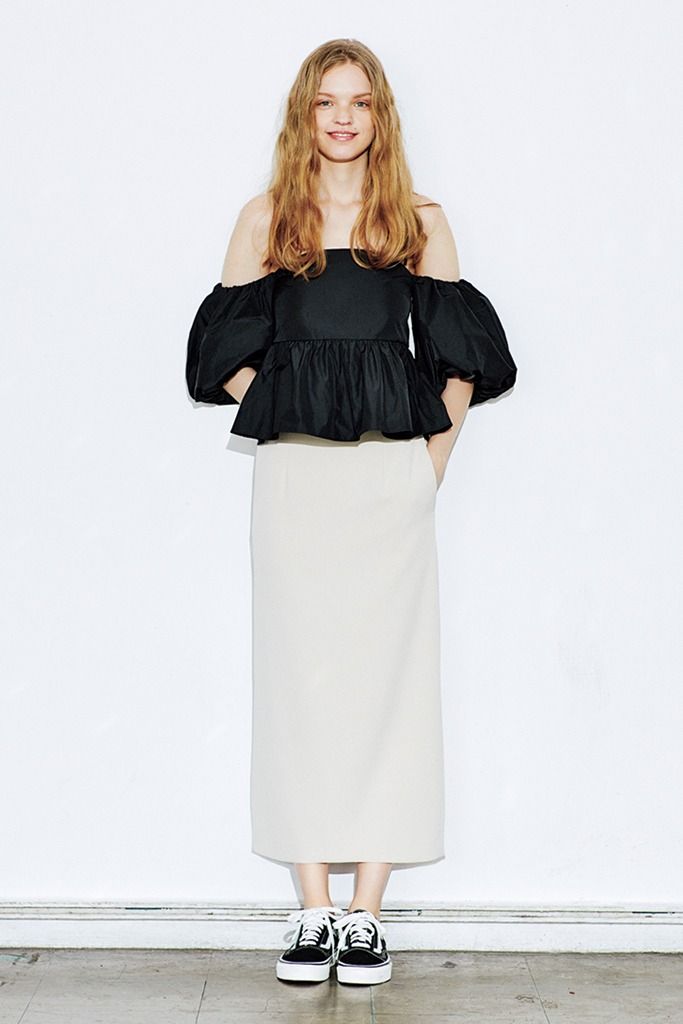 ベアトップにパフスリーブをアレンジした、オフショルダーのブラウスは、二の腕もカバーできて優秀。色も形も重みがあるぶん、下はまっすぐなシルエットの白を合わせ、すっきりまとめて。スニーカーもモノトーンでバランスよく、違和感のない仕上がりに。