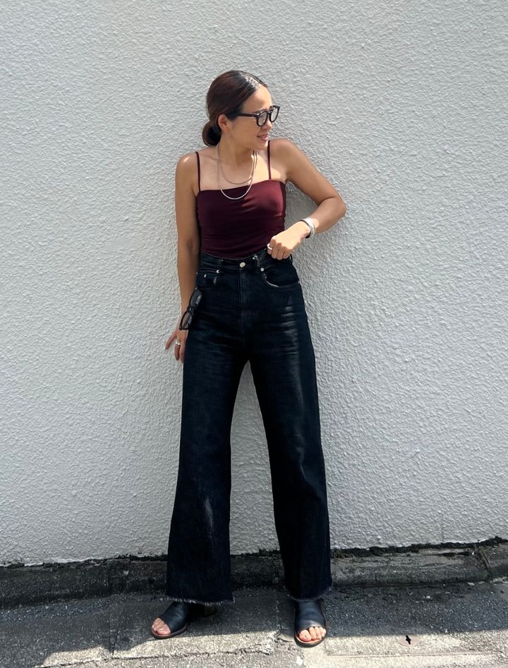 秋ムードなブラックデニムは水着を合わせて軽やかな肌見せを。「トップスは水着として買ったのですが、普段着にも使っています。秋になったらデニムシャツを羽織って、デニムオンデニムを楽しみたいなと妄想中です」