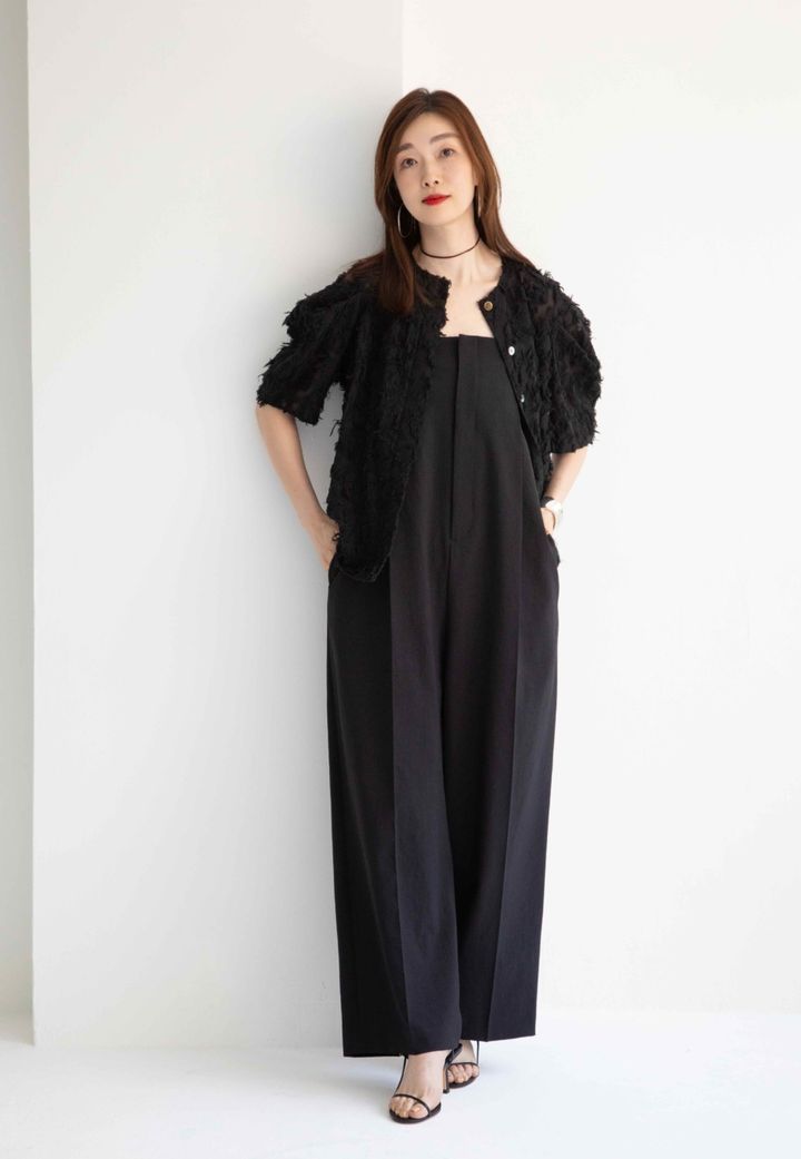 定番のオールブラックスタイルは異素材MIXで立体感を。「重く見えがちなブラックコーデなので、アクセサリーやシューズは華奢なラインのものやシルバーを選ぶことでライトな印象に仕上げているのがポイントです」
