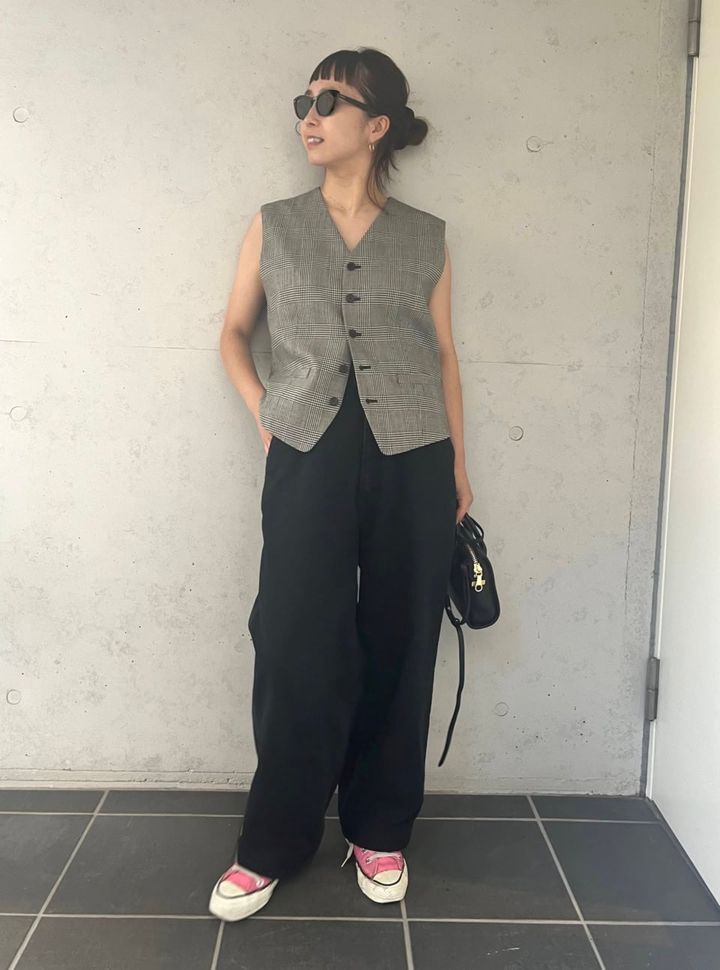 ラフなスケーターデニムにキレイめベストで大人ムード。「シックなカラートーンやトラッドな柄、素材感で秋らしさを取り入れました。大人っぽくまとめたスタイルに、足元はあえてピンクスニーカーを合わせて、軽やかさを出しています」