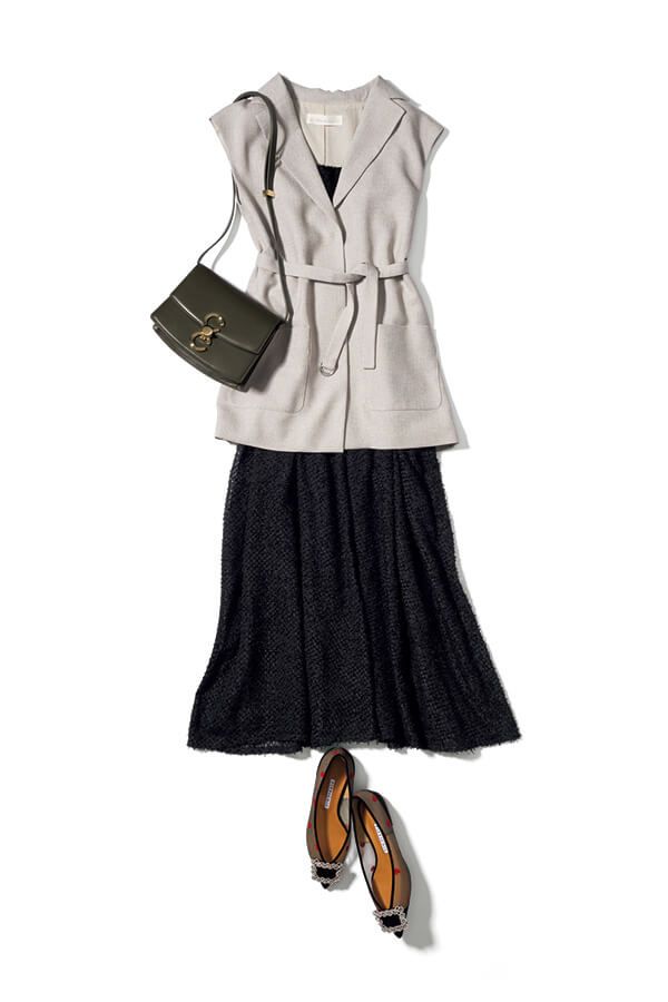 都会的なグレージュジレでミニマルな黒ワンピに知的さを