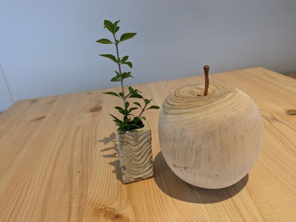 今回は「カフェラテ 温」と「珈琲ゼリー」を試食させていただきました。待っている間にも、手持ち無沙汰にならないようにと卓上に置かれているのが、こちらの置物。木のぬくもりが手に伝わって癒されます。