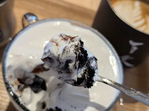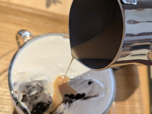 珈琲ゼリーの生クリームだけでまず一口。お口の中が濃厚になったところに、無糖のゼリーと合わせてさらに一口。香りと深みのある豆の旨みが絶妙なゼリーです。