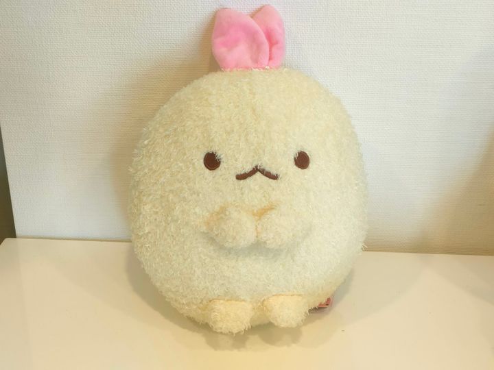 3つ目は、今回の買いものの中で1番大きなサイズのぬいぐるみです。揚げものシリーズ特有のフワフワな触り心地がポイントです。わが家には同じサイズの「えびふらいのしっぽ」もあるので、2つ並べるとかわいいです。