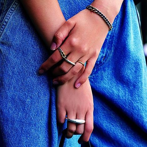 手元にはエッジィなシルバージュエリーを