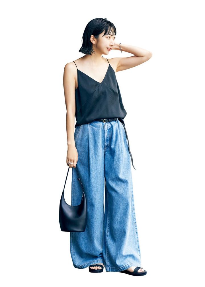「今年はデコルテや肩まわり、背中まで覗く大胆な肌見せにトライしたい気分。キャミはサテン素材で女っぽさが際立つ分、極太のワイドデニムでメンズっぽさをミックス。手元が寂しい印象にならないように存在感のあるシルバージュエリーを重ねます」キャミソール¥13,200(プラージュ)、デニムパンツ¥48,400(エーゴールドイー)、ベルト¥9,900(レフィージェ)、サンダル¥25,300(ラオコンテ/すべてプラージュ 代官山店) ローソウルのバッグ(本人私物)